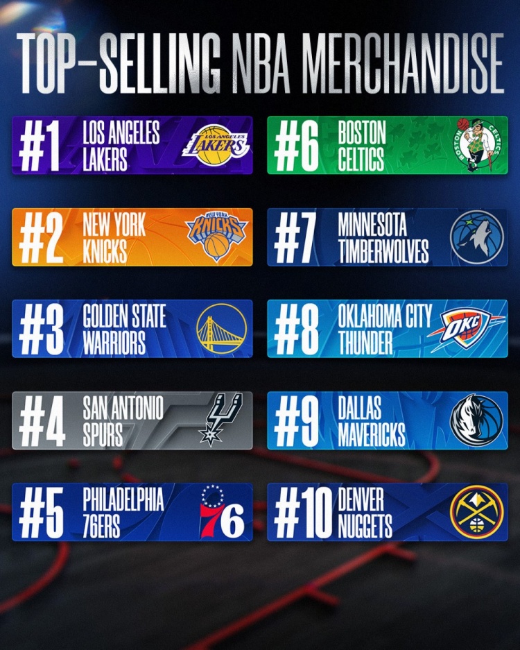 开云体育app-上半赛季球队球衣销量!湖人尼克斯勇士前3 马刺第4 雷霆第8